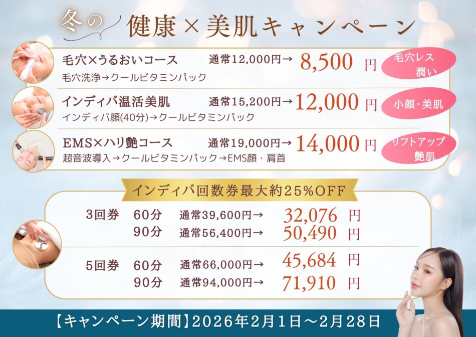 (WEB予約方法→インディバ→「2月限定 インディバ×温活美肌」をお選びください。)